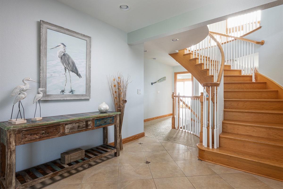 The top floor has a wide open floor plan, vaulted ceilings and views of both the sound and the ocean, with front and rear decks and a hardwood floor. Plenty of comfortable seating accommodate your large group, with two dining tables. The gourmet kitchen features two refrigerators, two dishwashers, a six-burner gas range, separate ice maker and walk-in pantry. The living room features sweeping views of the sound and a stereo with exterior speakers provide a soundtrack for the sunset. The top floor also features a spacious deluxe king master suite that opens onto the large soundfront deck, with a television, whirlpool tub and double shower.